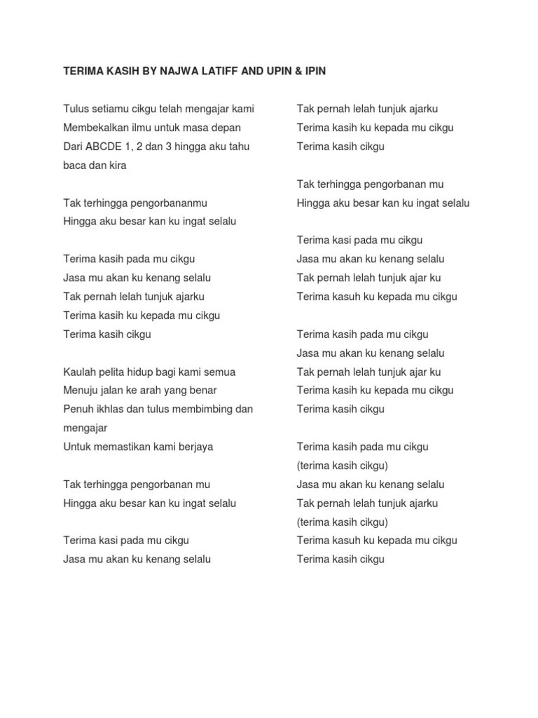 Lagu Upin Ipin Terima Kasih Cikgu : Guru Besar Upin Ipin Sinceredsx. Request chord services , organizes chords . Grab your guitar, ukulele or piano and jam along in no . Terima kasih cikgu merupakan lagu yang dirakam pada tahun 2012 oleh asyiela putri azhar yang membawakan watak upin dan ipin bersama najwa latif. Temokake video cekak sing kagayut karo lagu upin ipin terima kasih cikgu ing tiktok. Najwa latifterima kasih cikgu℗ nova music (m) sdn .